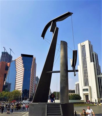 The 15-meter tall carbon steel structure stands at the intersection of Paseo de la Reforma and Avenida Juárez, featuring curved rings and geometric shapes.