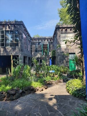 The Frida Kahlo Museum is a historic residence with art collection in Coyoacán, a southern borough of Mexico City, also known as Casa Azul. The two-story building is organized around a central courtyard with tropical plants, with rooms displaying furniture from different periods and paintings on the walls.