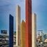 The surfaces of the towers feature horizontal grooves spaced one meter (3.3 feet) apart, creating pronounced shadow patterns in sunlight. These grooves alter the appearance of the structures depending on the time of day and viewing angle.