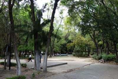 Jardín Ramón López Velarde is an urban green space in Colonia Roma Norte that runs along Avenida Cuauhtémoc with native plants, mature trees, and interconnected walking paths. Benches and landscaped areas are arranged throughout to encourage strolling and pausing in different spots.