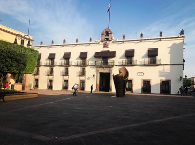 Casa de la Corregidora features large balconies, stone masonry walls, and a symmetrical facade that stands prominently in the central plaza of Santiago de Querétaro.