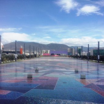The central plaza displays a large mosaic titled 'Tribute to Women of the World' created by Byron Gálvez Avilés using countless ceramic pieces in different colors. This artwork shapes how visitors experience the space and encourages people to spend time observing its intricate patterns.