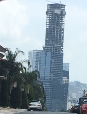 The construction process from 2013 to 2017 required the largest concrete foundation pour in Mexico, utilizing 1200 trucks over 48 continuous hours.