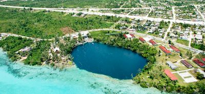 The sinkhole connects to the Ponderosa cave system, containing specific geological formations where fresh and salt water create visible separation lines.