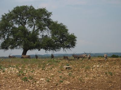 Natural Bridge Wildlife Ranch extends across 450 acres of Texas Hill Country with rolling landscapes, juniper thickets, and natural creek beds.