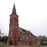 The red brick church, designed by architect Leo M.J. Dielmann in 1906, features a prominent tower with five stages and a wooden spire.