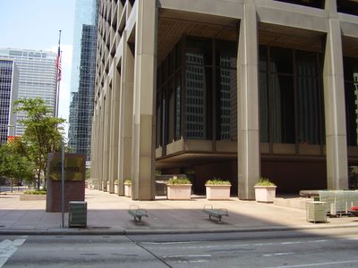The structure features a glass-enclosed section spanning the first five floors and includes fountains along Louisiana Street that replaced drive-through bank kiosks.