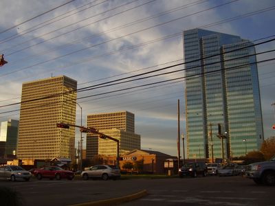 Phoenix Tower rises 434 feet into the Houston skyline with its modern glass and concrete exterior along Southwest Freeway between Downtown and Uptown districts.