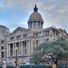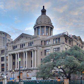 The Harris County Courthouse features grand stone columns, symmetrical design elements, and intricate architectural details across its six-story structure.