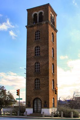The six-story brick and limestone structure stands 67 feet tall near Lady Bird Lake, featuring round-arched windows and cast iron light fixtures.