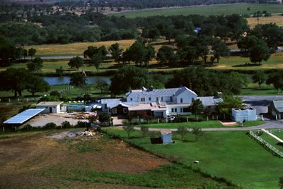 The LBJ Ranch spans across Texas Hill Country with the Pedernales River flowing past its boundaries, featuring multiple swimming pools and an airstrip.
