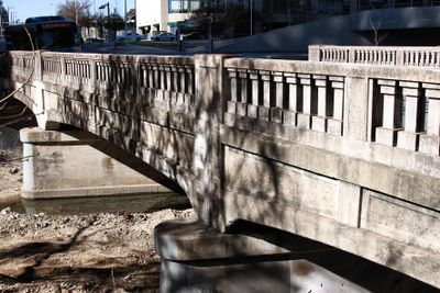 The West Fifth Street Bridge stretches 112 feet long and 52.5 feet wide, featuring a central arch that spans 44 feet between concrete piers.