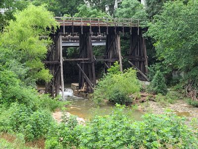 The trestle stands 35 feet above Shoal Creek and measures 30 feet in width, featuring an open-deck design made of creosote-coated pine timber.