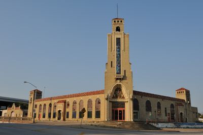 The Fort Worth Public Market features red-tiled roofs, stucco walls, and arched doorways within its Mission Revival architectural design at Henderson Street.