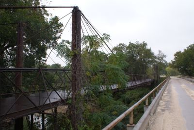 The Bluff Dale Suspension Bridge extends 225 feet across the Paluxy River with fourteen 1-inch-diameter cables connecting to iron pipe towers.
