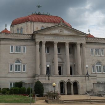 The First United Methodist Church features a three-story stone construction with a dome that extends to a fourth level on Lamar Avenue.