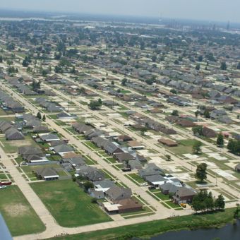 Chalmette is a census-designated place in St. Bernard Parish located southeast of New Orleans along the Mississippi River. The area contains residential neighborhoods mixed with commercial zones and extends across flat, low-lying terrain typical of the Louisiana bayou region.