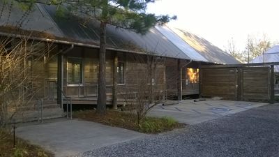 The fourteen-acre property features native trees, shrubs, a bamboo grove, multiple walking paths, and a footbridge spanning a deep ravine.