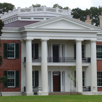 Melrose is a two-story mansion in Greek Revival style set on a large estate, featuring symmetrical columns, broad verandas, and fine decorative moldings. The building sits on extensive grounds and contains numerous original furnishings from the 1800s.