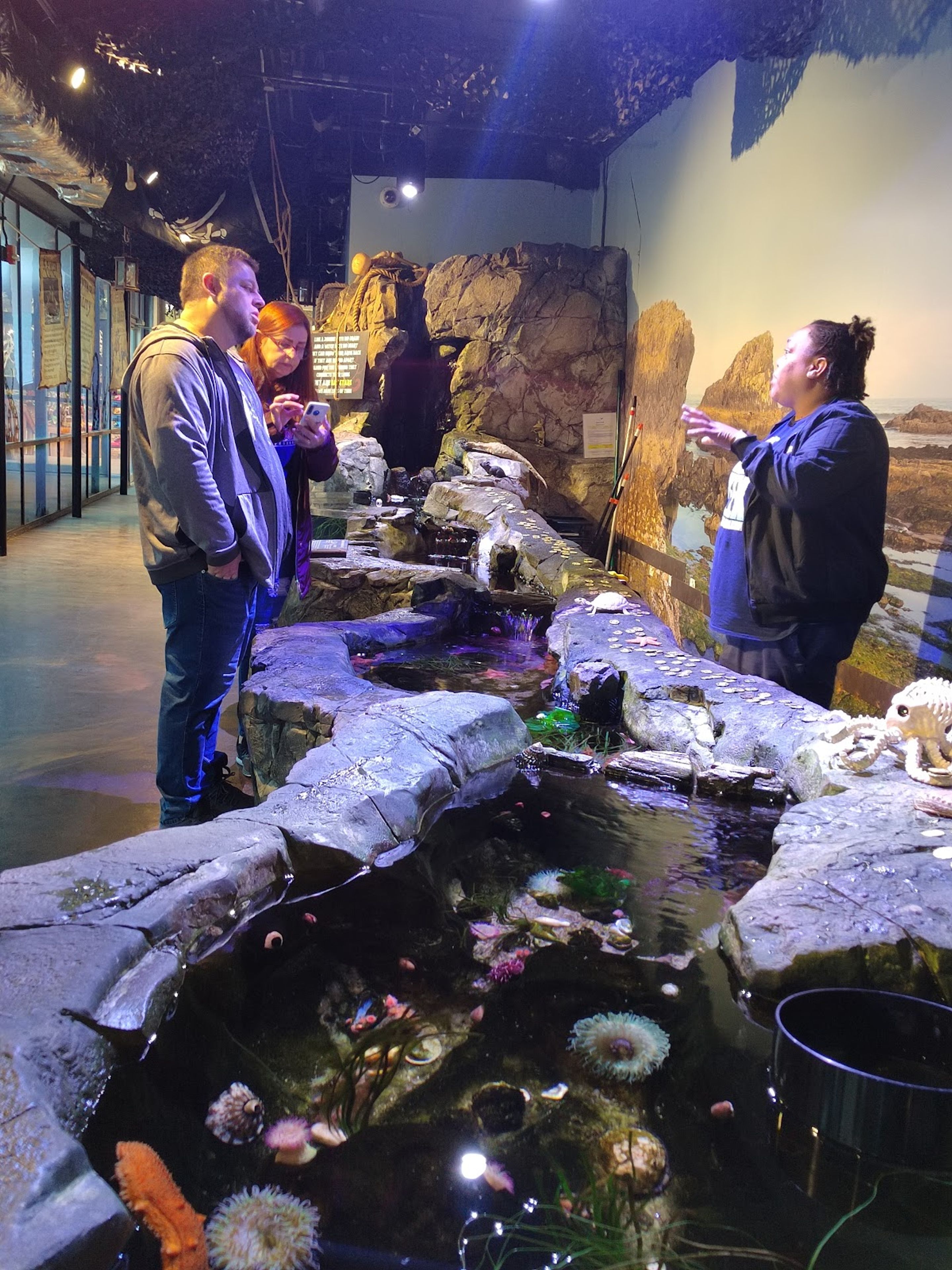 The facility demonstrates marine conservation through interactive exhibits where visitors touch sea creatures and learn about underwater ecosystems.