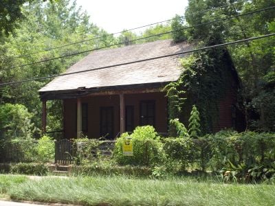 The wood-frame cottage at 3703 Old Shell Road features interconnected rooms without hallways and includes an outlying kitchen and chapel connected by brick walkways.