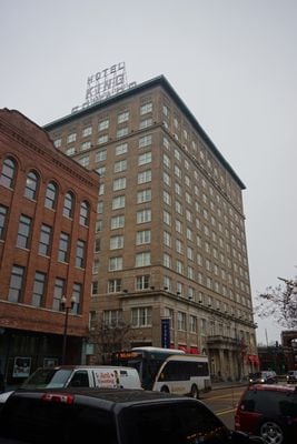 The King Edward Hotel extends twelve stories high with beige brick walls and classical architectural details at Capitol and Mill Streets intersection.