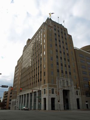 The building features an antenna spire that extends its total height to 322 feet and was designed by architects Gresham, Smith and Partners.