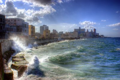 The Malecón extends for 8 kilometers along the northern coast of Havana, featuring a wide esplanade and protective seawall against ocean waves.