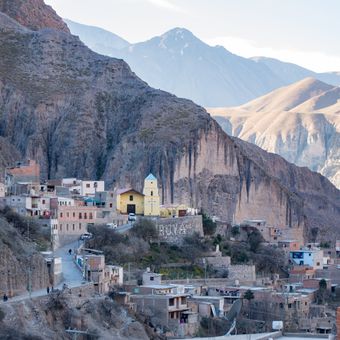 Iruya is a mountain village in Salta Province situated at 2,780 meters elevation on steep slopes shaped by the Iruya River valley. The settlement's layout follows the terrain closely, with narrow streets winding upward and buildings stacked along the inclines in response to the dramatic landscape.