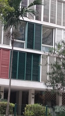 The Edifício Lausanne consists of two identical structures with a shared front garden, featuring colorful metal window shutters across its 15 floors.