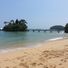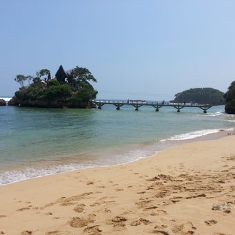 The beach stretches for 2 kilometers along the southern coast of Java, featuring white sand shores and three small offshore islands connected by bridges.