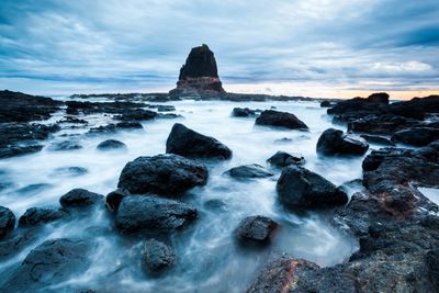 The volcanic formation stands tall against the Bass Strait coastline, displaying distinct geological patterns formed through millions of years of natural processes.