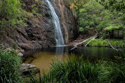 The waterfall forms a cascade system within a natural pool setting, surrounded by eucalyptus trees and native vegetation of New England region.