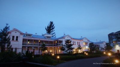 The three-story building features a symmetrical cruciform plan with two towers and decorative cast iron balustrade panels along its verandahs.