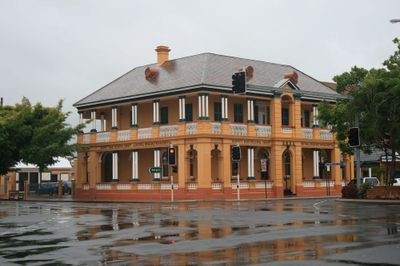 The Commercial Bank, constructed in 1891, occupies a prominent corner at 191-193 Bourbong Street with ornate cast iron details and wide verandahs.