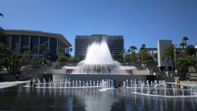 The Arthur J. Will Memorial Fountain includes a wade-able membrane pool where visitors can cool off during warm Los Angeles days.