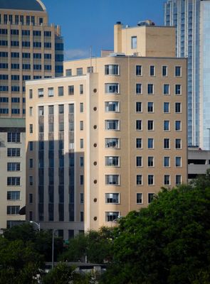Architect Shirley Simons incorporated vertical window arrangements and horizontal bands into the design, creating a distinct silhouette on the Austin skyline.