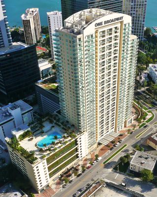 One Broadway rises 413 feet into the Miami skyline with 42 floors of residential units featuring glass and steel construction elements.