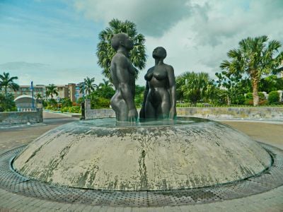 The park's central bronze sculpture 'Redemption Song' depicts an 11-foot male and female figure looking skyward, created by Jamaican artist Laura Facey.