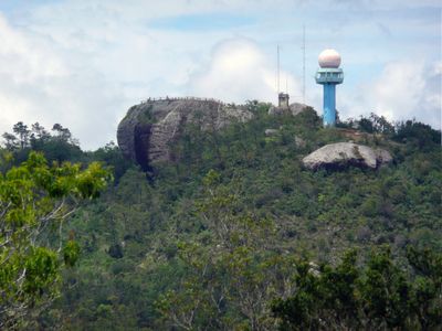 Visitors can climb 459 steps to reach Gran Piedra summit at 1,234 meters elevation, offering views extending to Jamaica during favorable weather conditions.