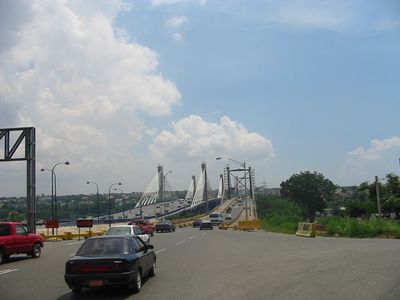 The Puente Juan Pablo Duarte is a cable bridge spanning the Ozama River that connects two districts of Santo Domingo. The structure features distinctive pylons and steel cables that support a wide roadway for vehicles and pedestrians.