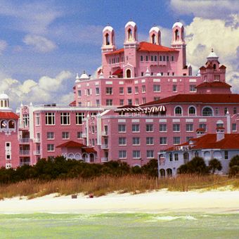 Don CeSar is an eight story hotel combining Mediterranean and Moorish Revival design along the beachfront of St. Pete Beach on Florida's Gulf Coast. The pink facade stands directly on the shoreline, forming a contrast with the white sand and blue water.