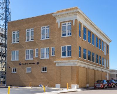 The three-story yellow brick building at 1009 4th Avenue West features ground floor ornamental details and a decorative cornice crowning the third floor.