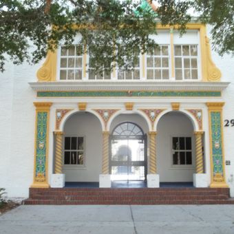The Bay Haven School building features Spanish architectural elements across its structure, with distinctive design details by architect M. Leo Elliott.
