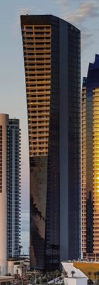 The Muse building reaches 47 floors into the sky, featuring extensive glass windows that allow natural light throughout the entire structure.