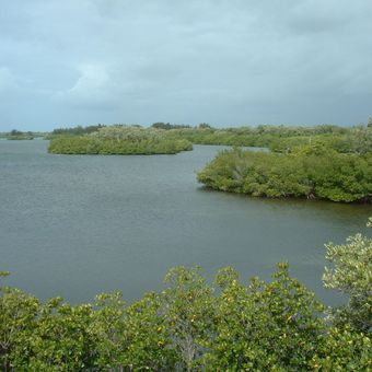 Sebastian Inlet State Park is a coastal protected area along the Atlantic shore with sandy beaches, tidal pools, and waterways that connect the ocean to the Indian River. The landscape features open water channels, shallow bays, and natural shoreline habitats created by tidal movements.