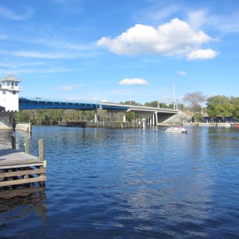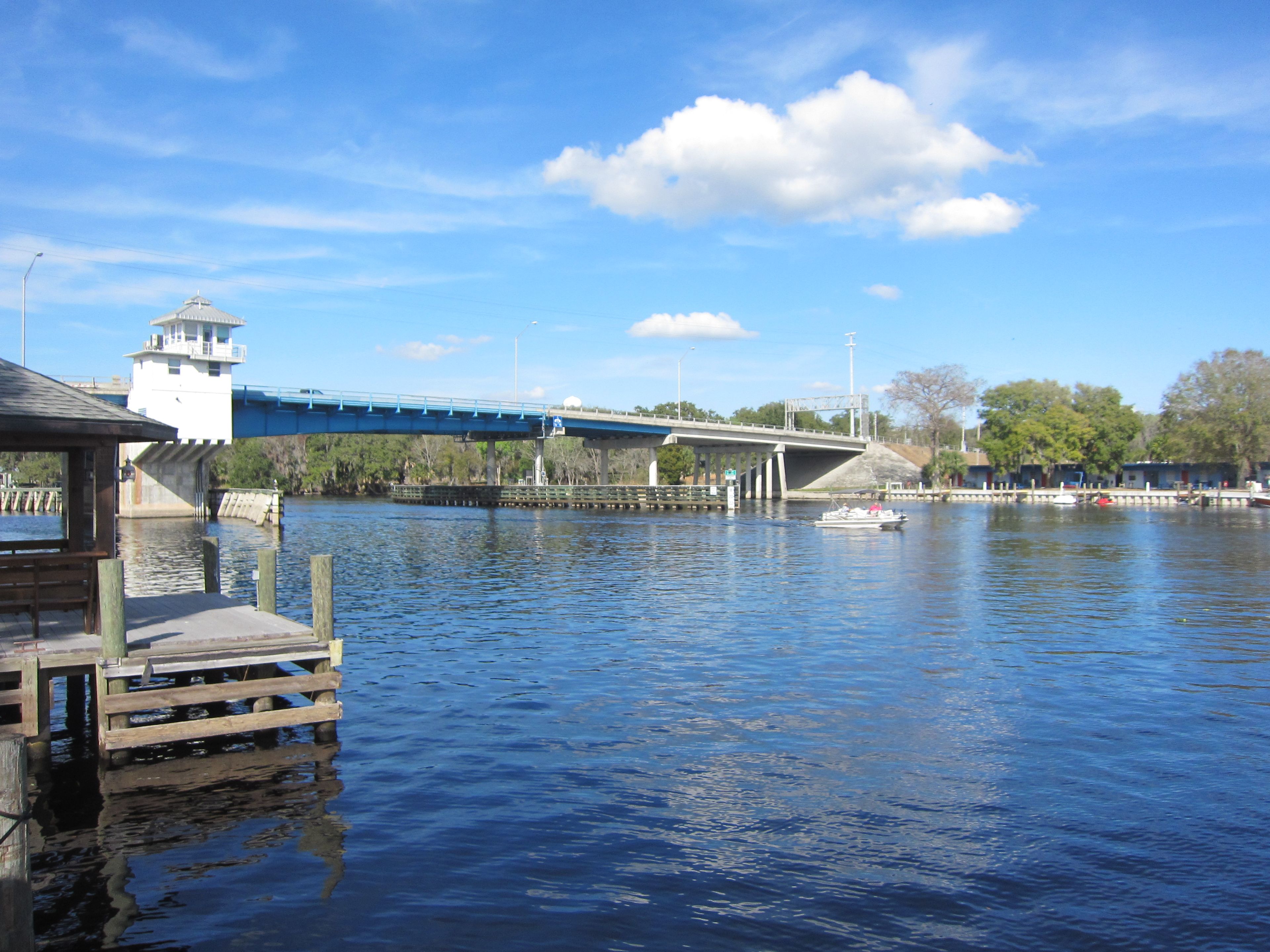 The Astor Bridge extends across the St. Johns River with a single-leaf bascule mechanism that lifts to allow water vessels to pass underneath.