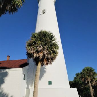 St. Marks Light is a white tower located where the St. Marks River meets the Gulf of Mexico, rising approximately 22 meters above the water. The structure stands on a piece of land surrounded by wetlands and protected by the St. Marks National Wildlife Refuge.
