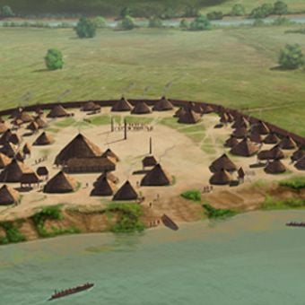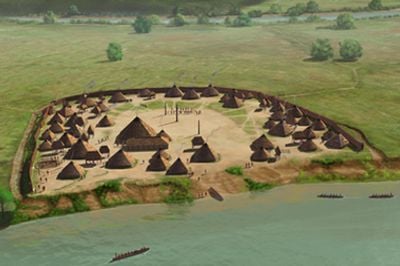 The site spans five acres featuring residential structures, storage buildings, and a central plaza surrounded by defensive ditches and wooden walls.