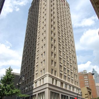 The skyscraper faces the English-American Building across Peachtree Street, creating a notable architectural pairing in downtown Atlanta.